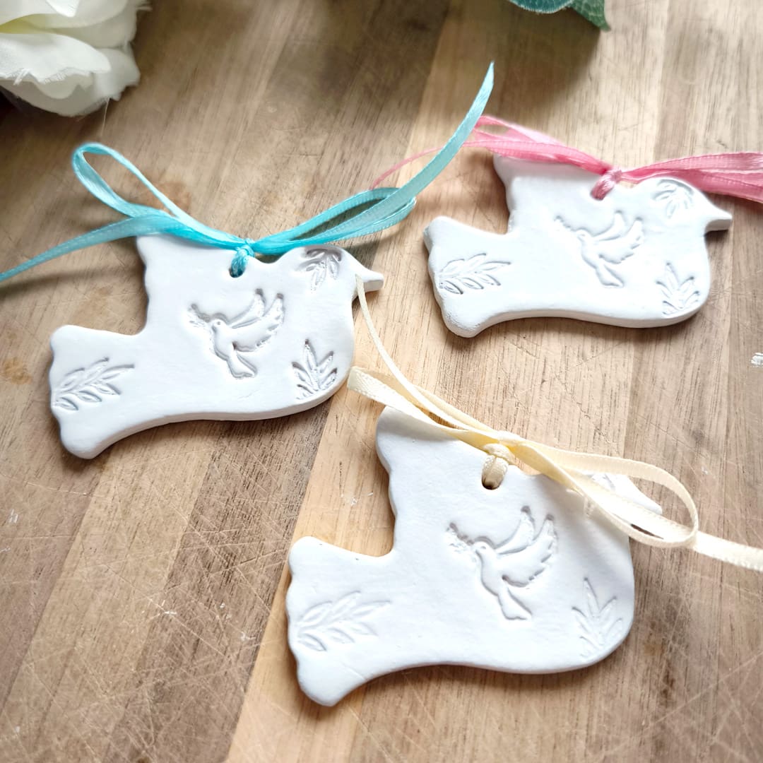 The clay decoration is a handmade dove with embossed details.