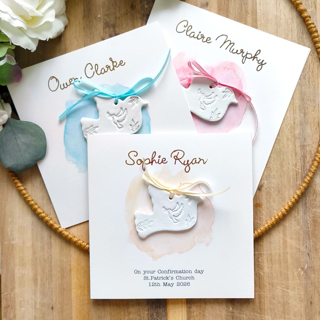 Our cards are personalised with the Child’s name in gold and the date and place of their Confirmation.