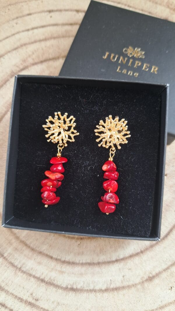 Handmade in West Cork using crimson stone chips and 18ct gold plated earring posts.