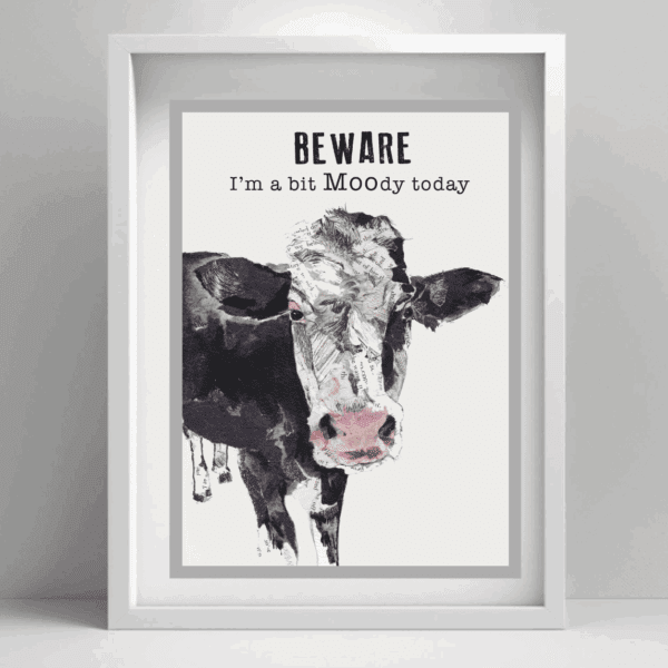 Bring some humor and charm to your home with this unique cow art print. Featuring a hand-crafted collage of a black and white cow paired with the playful phrase “Beware I’m a bit Moody Today,” this piece makes the perfect gift for animal lovers, farmers, or anyone who appreciates a touch of quirky farmhouse style.