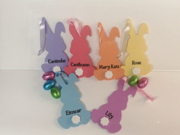 Cute personalised Easter Bunny gift tag. Made from 3mm acrylic, engraved with your name of choice and a little white tale, comes with a length of matching ribbon. Add a personalised keepsake to your Easter gift this year. To order select the colour of your bunny from the drop down list and add the name into the text box. Each bunny is approx 7*15cm.