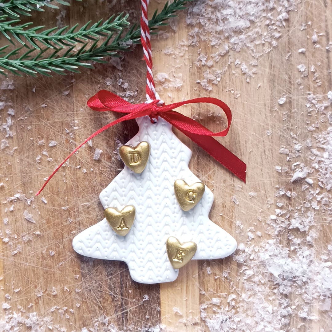 Our hand cut, knit texture, clay Christmas tree decorations can be decorated with gold hearts with the initials of each of your family members. A really special addition to your Christmas tree this festive season!