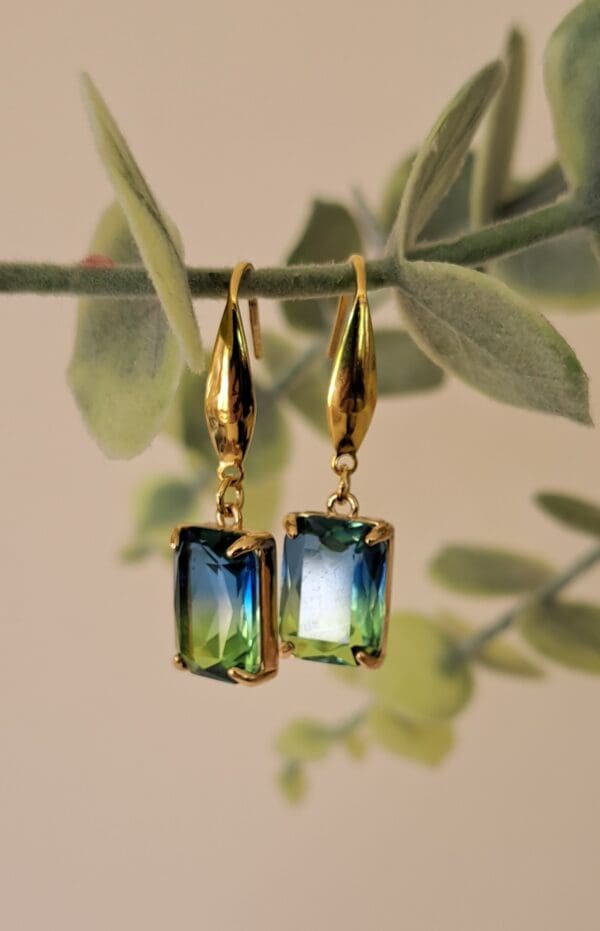 These dainty earrings with a stunning graduated glass are designed and made in our West Cork Studio using 18ct gold plated surgical steel earring posts.