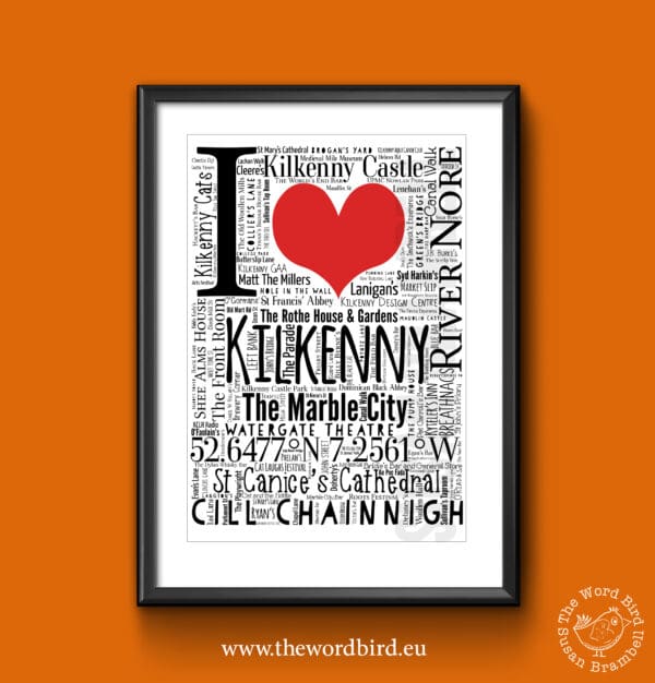 This I Love Kilkenny (city) word art print was designed by Susan Brambell, an Irish designer working and living in Co Wicklow. It’s A3 in size and is sold rolled in a tube for ease of worldwide posting. It fits into an IKEA frame or similar.