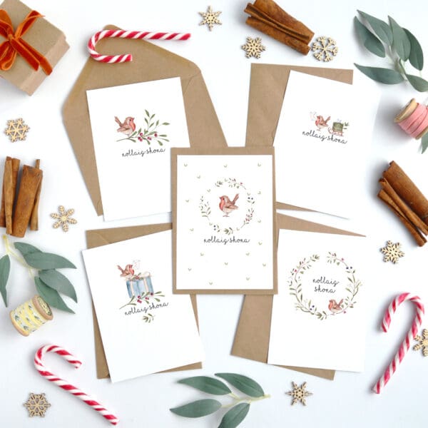 Irish Language 5 Pack Illustrated Christmas Card, Robin Themes Christmas Card, Gaelic Holiday Cards Pack, Irish Made Cards, Carta Nollaig