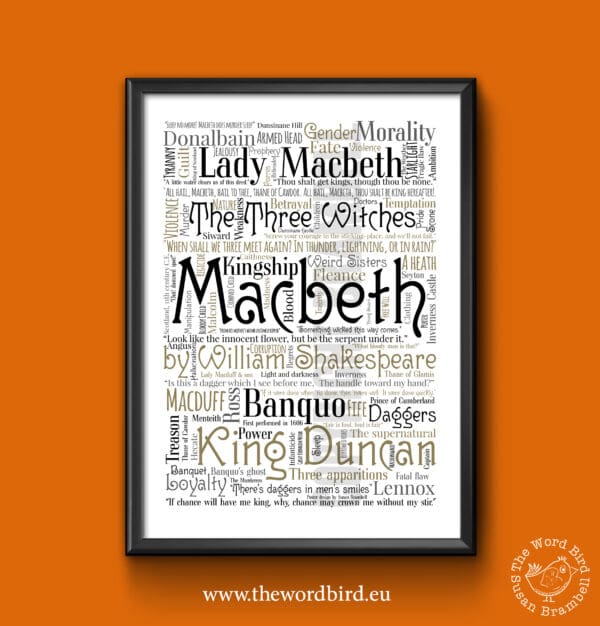 All the characters, place names, key themes and symbols from Shakespeare’s play of treachery and ambition, regicide and madness. It was good in 1606 and it’s still a ripping watch or read today. This print is an ideal revision aid for a student’s room and is a good discussion point for parents to pick words out and ask their son or daughter to explain why that word is in there.