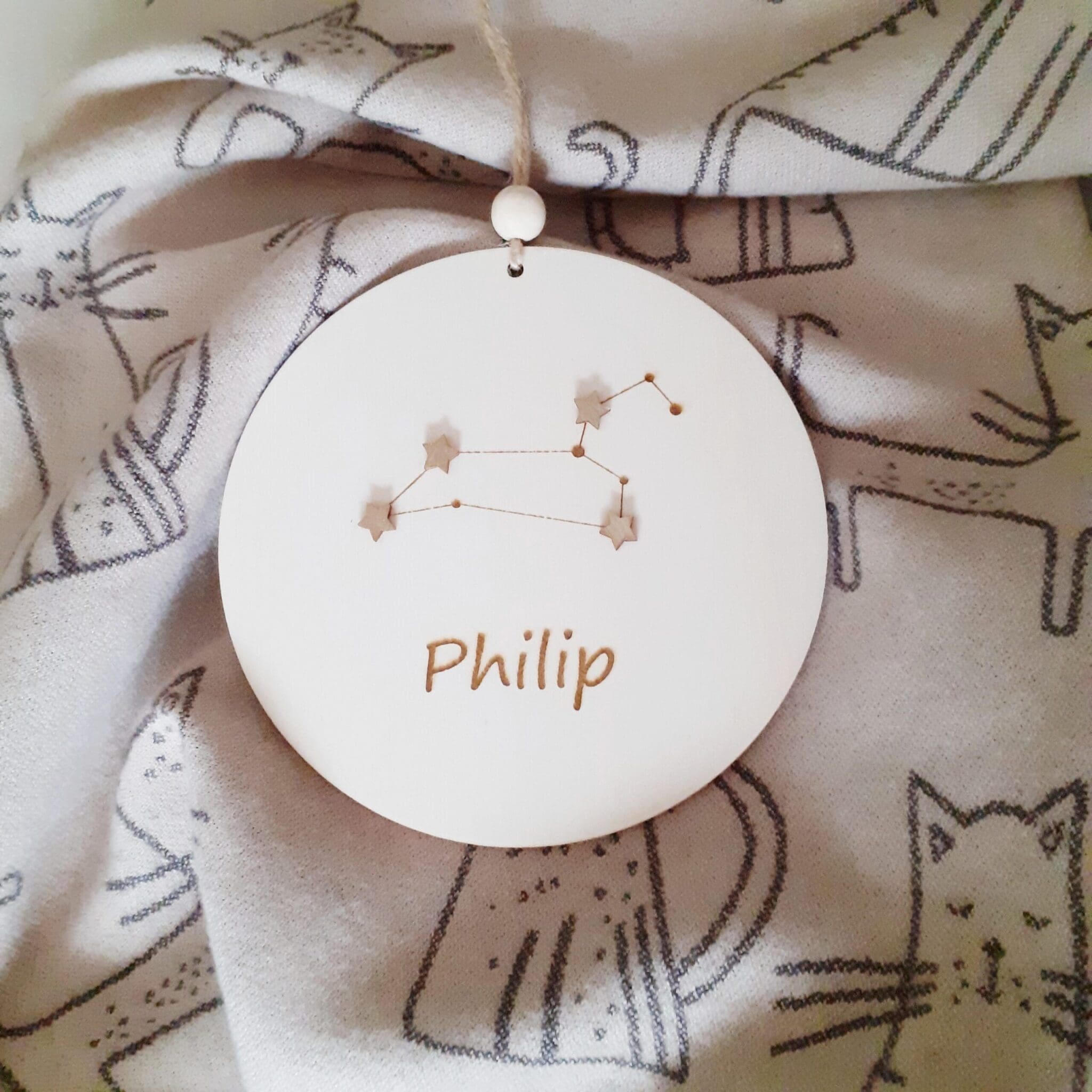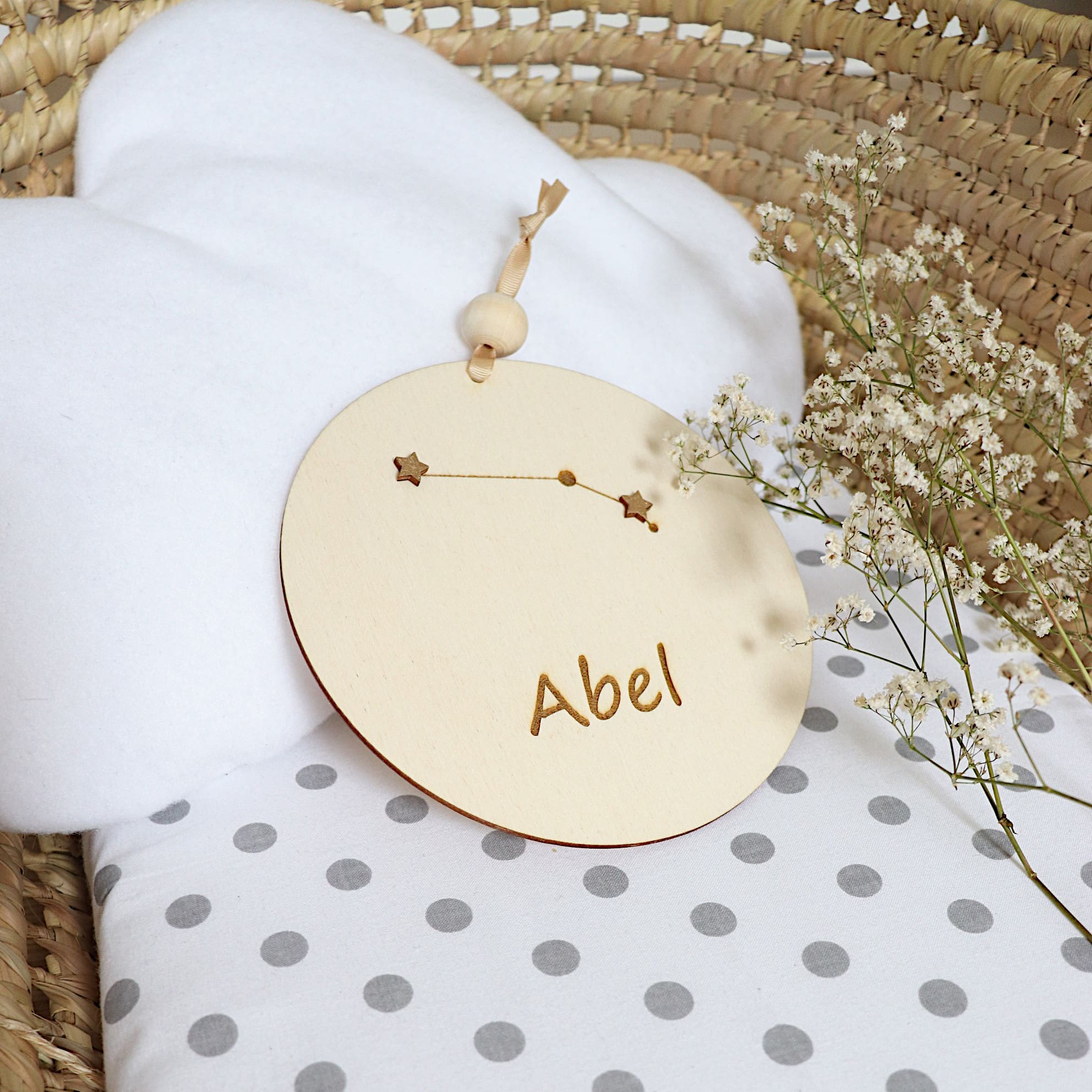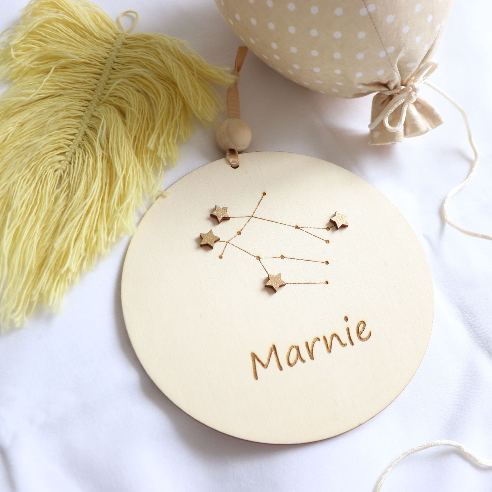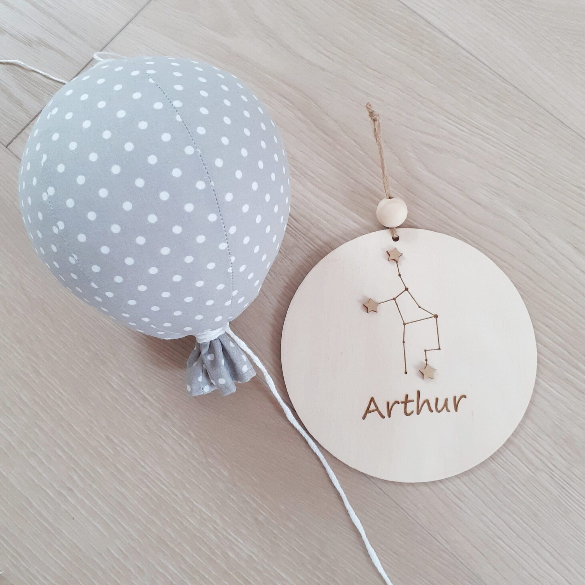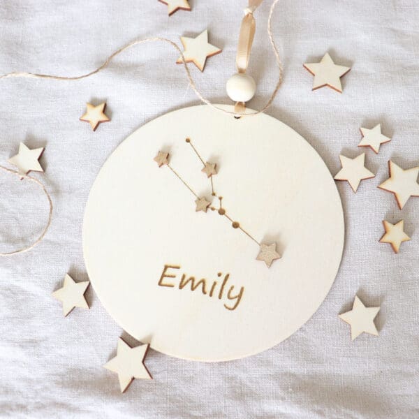 The decoration is enriched with a zodiac constellation, making it not only a charming decoration but also a symbolic keepsake that will last a lifetime. The name personalization adds a special, individual touch, making it ideal for a newborn’s room, a nursery, or a child’s bedroom.