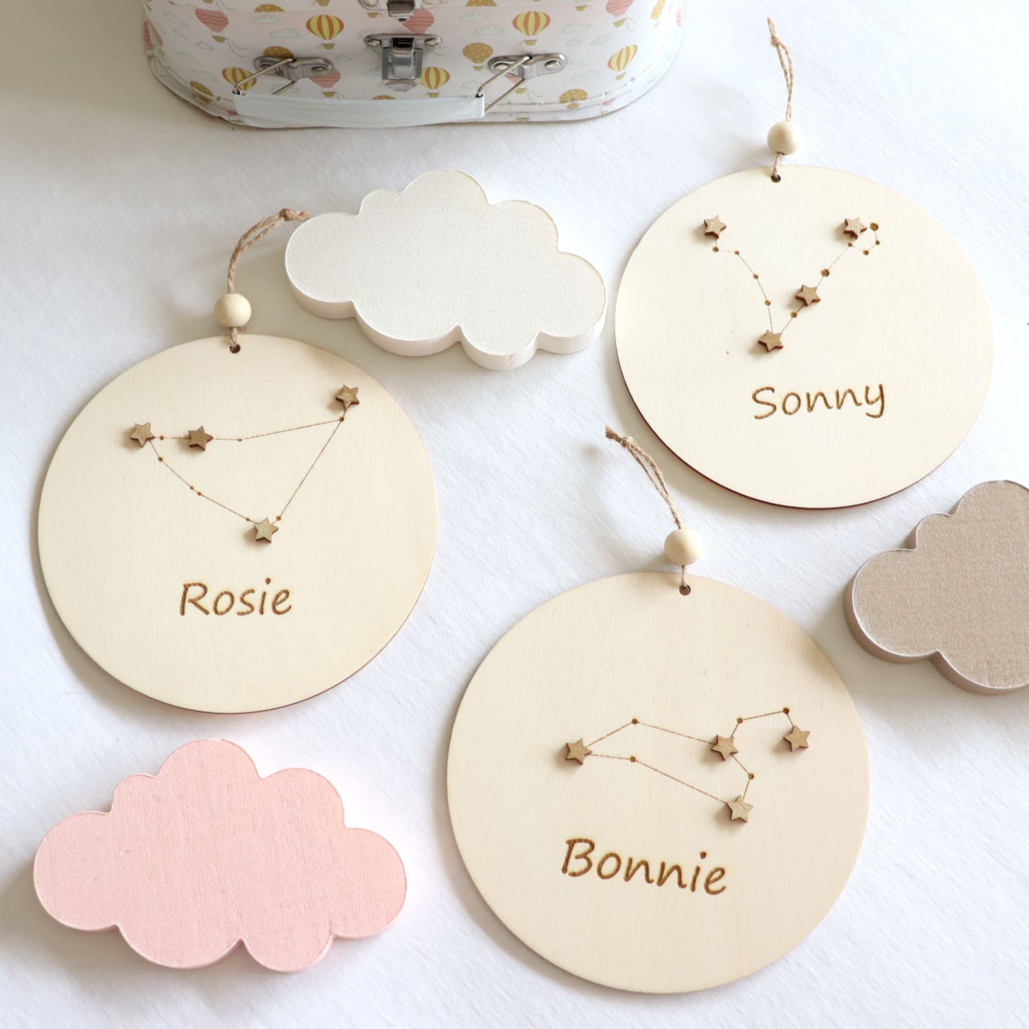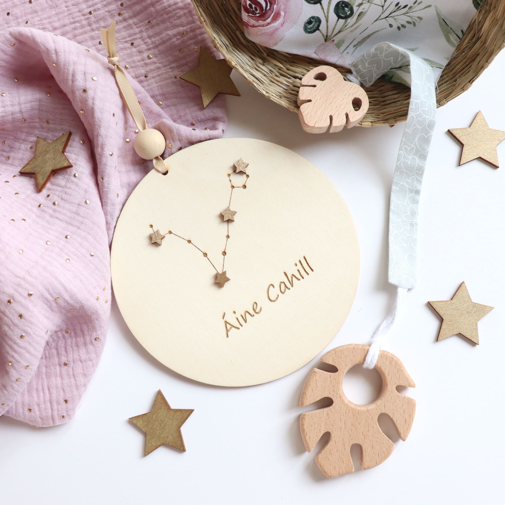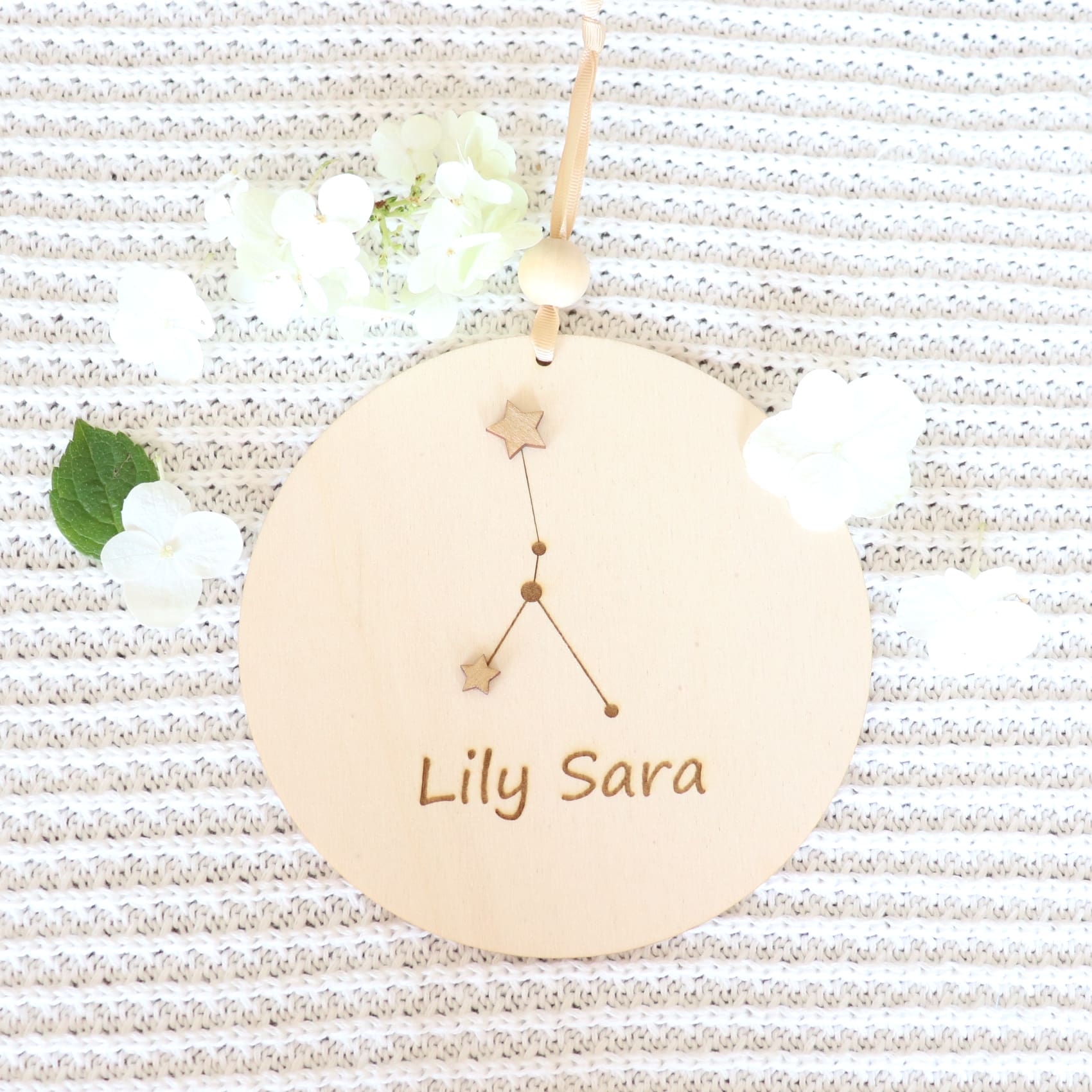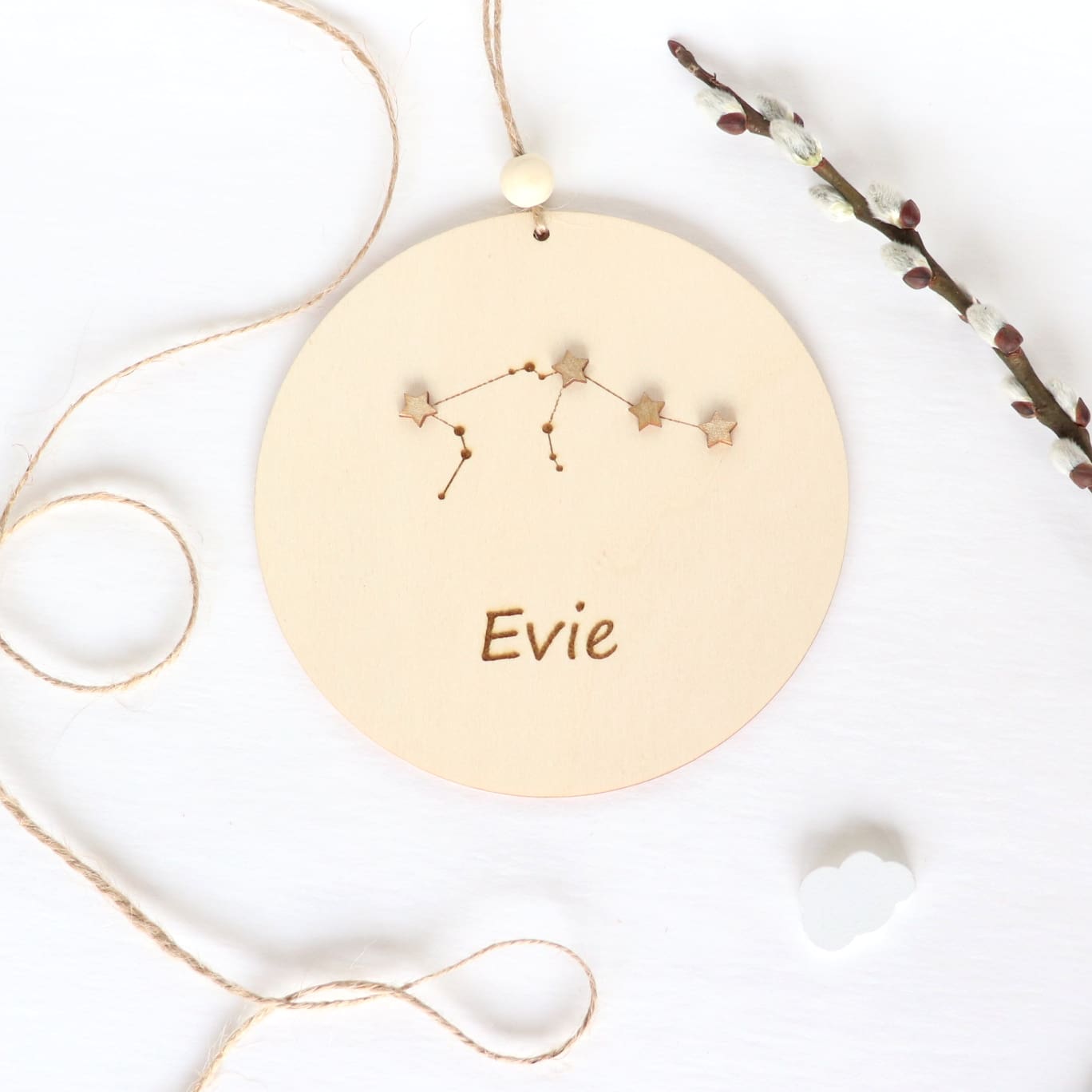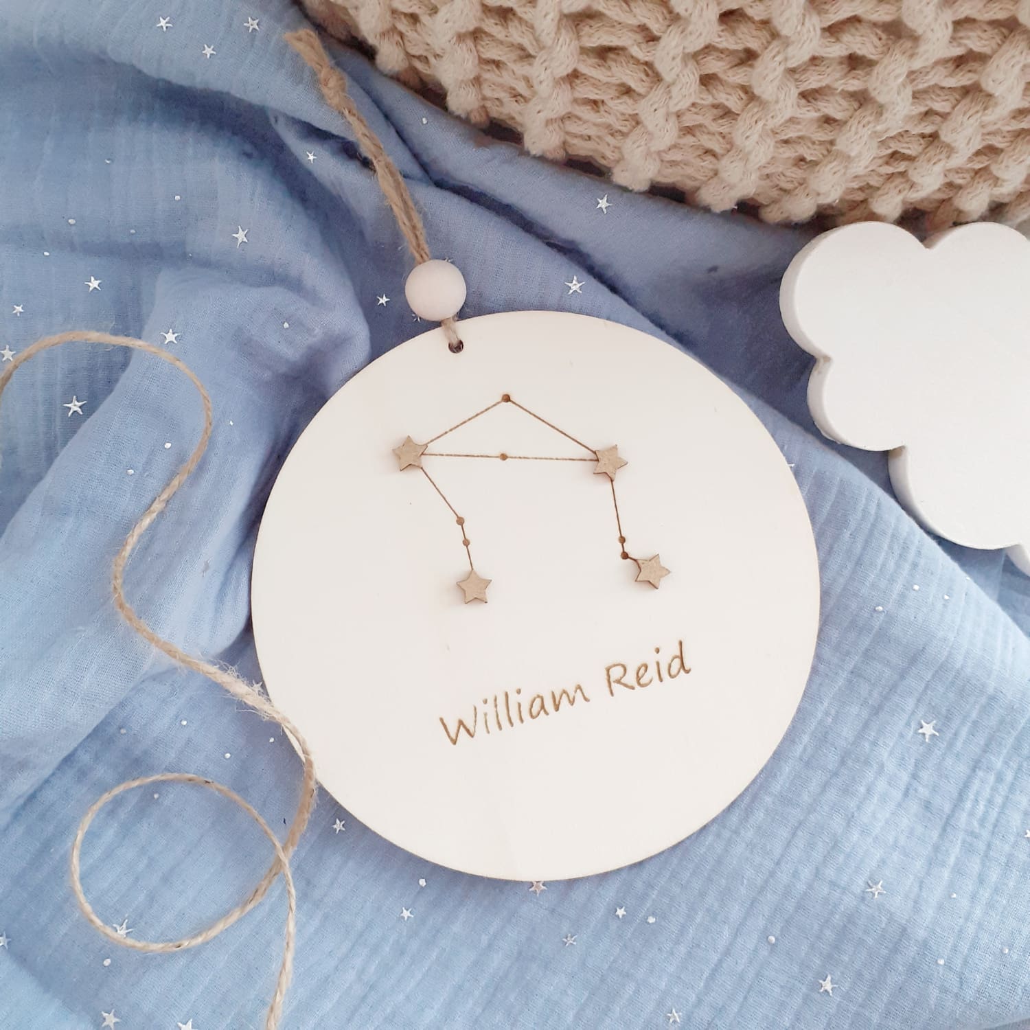 The decoration is enriched with a zodiac constellation, making it not only a charming decoration but also a symbolic keepsake that will last a lifetime. The name personalization adds a special, individual touch, making it ideal for a newborn’s room, a nursery, or a child’s bedroom.