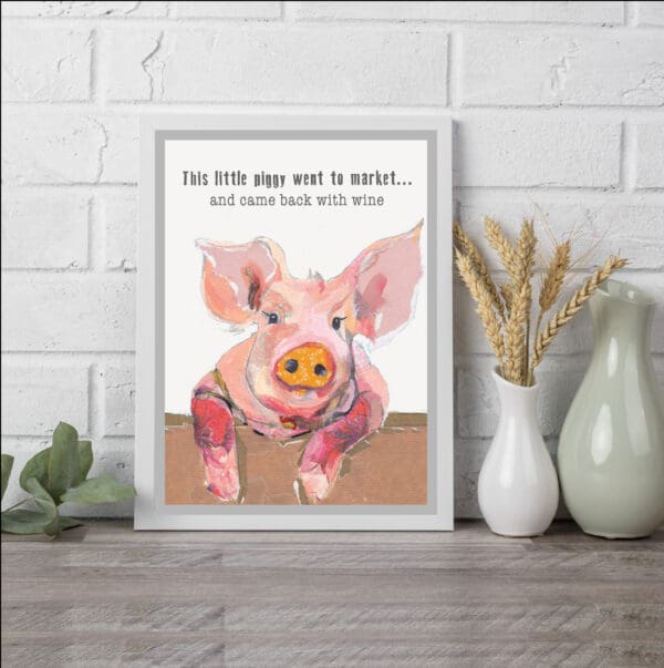 Bring charm and humor to your home with this “This Little Piggy Went to Market… and Came Back with Wine” art print. Featuring a playful mixed media pig illustration with a witty twist on the classic nursery rhyme, this print makes the perfect farmhouse kitchen decor or a lighthearted gift for wine lovers. Printed on high-quality paper, this piece adds a touch of rustic whimsy to any space. Frame not included.